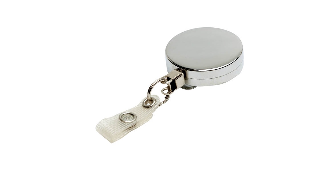Metalen yoyo met ID-strap en clip. Aan de achterzijde van de yoyo is een clip bevestigd ter bevestiging aan kleding. Yoyo-koord 80 cm