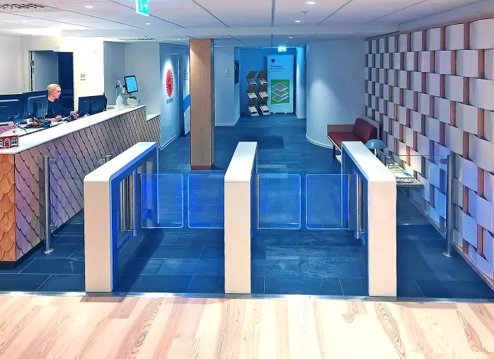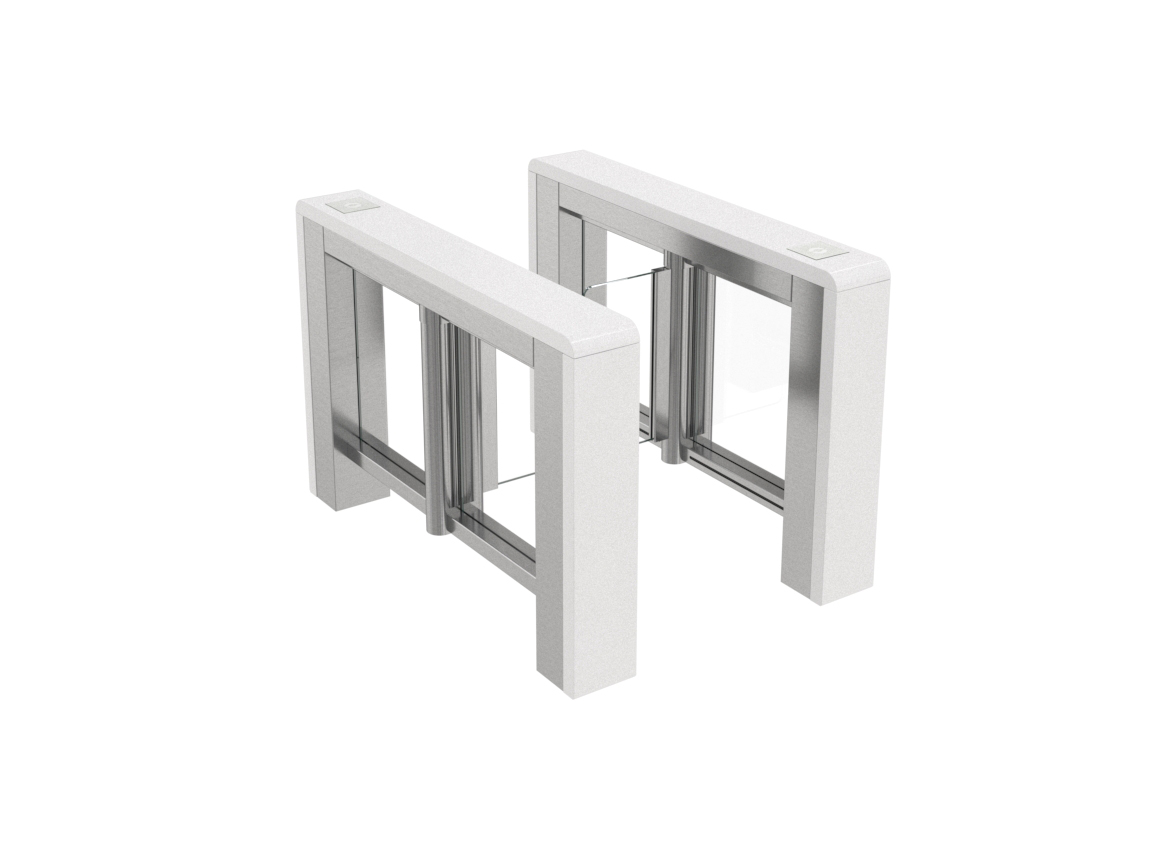 De glazen panelen draaien, zodra de bezoeker zijn of haar pas heeft aangeboden, altijd van de gebruiker af. Zo wordt er een veilige en gebruiksvriendelijke doorgang gecreëerd.