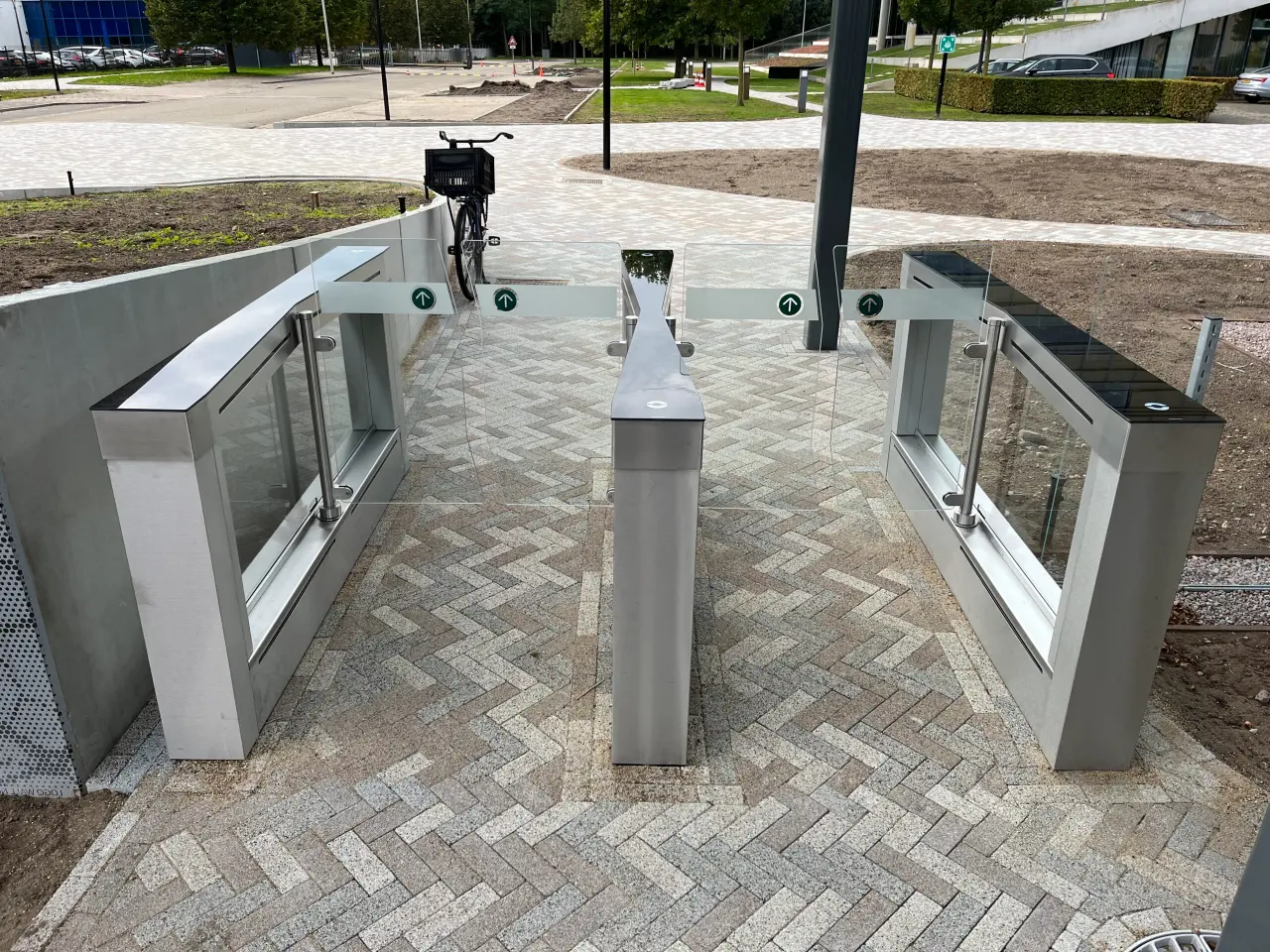 Bij de entree van de portiersloge hebben wij twee fietssluizen geplaatst. Deze fietssluizen zijn uit onze range EasyGates, de Easygate SPT Outdoor. Dit is een fietspoort die zowel buiten als binnen geplaatst kan worden en heeft een strakke en moderne vormgeving. Het is een uniek nieuw model fietssluis met loopsysteem voor detectie van fietsers.