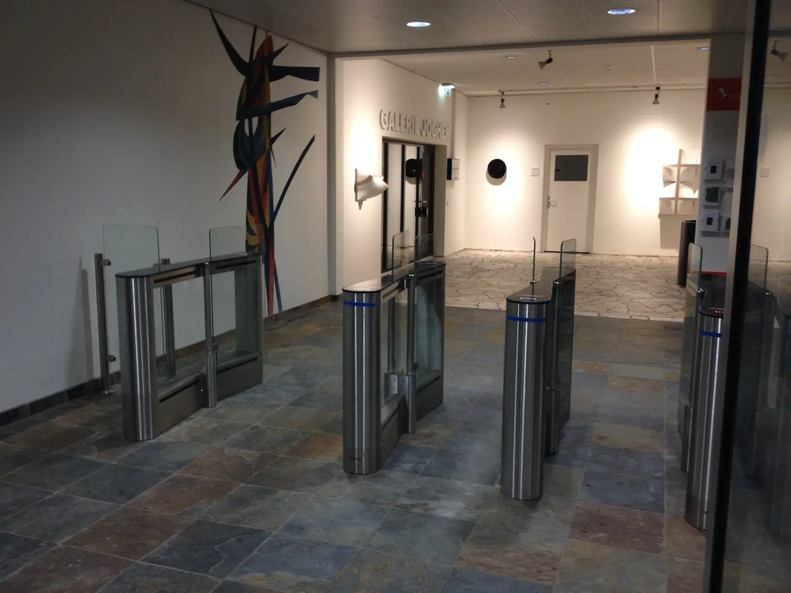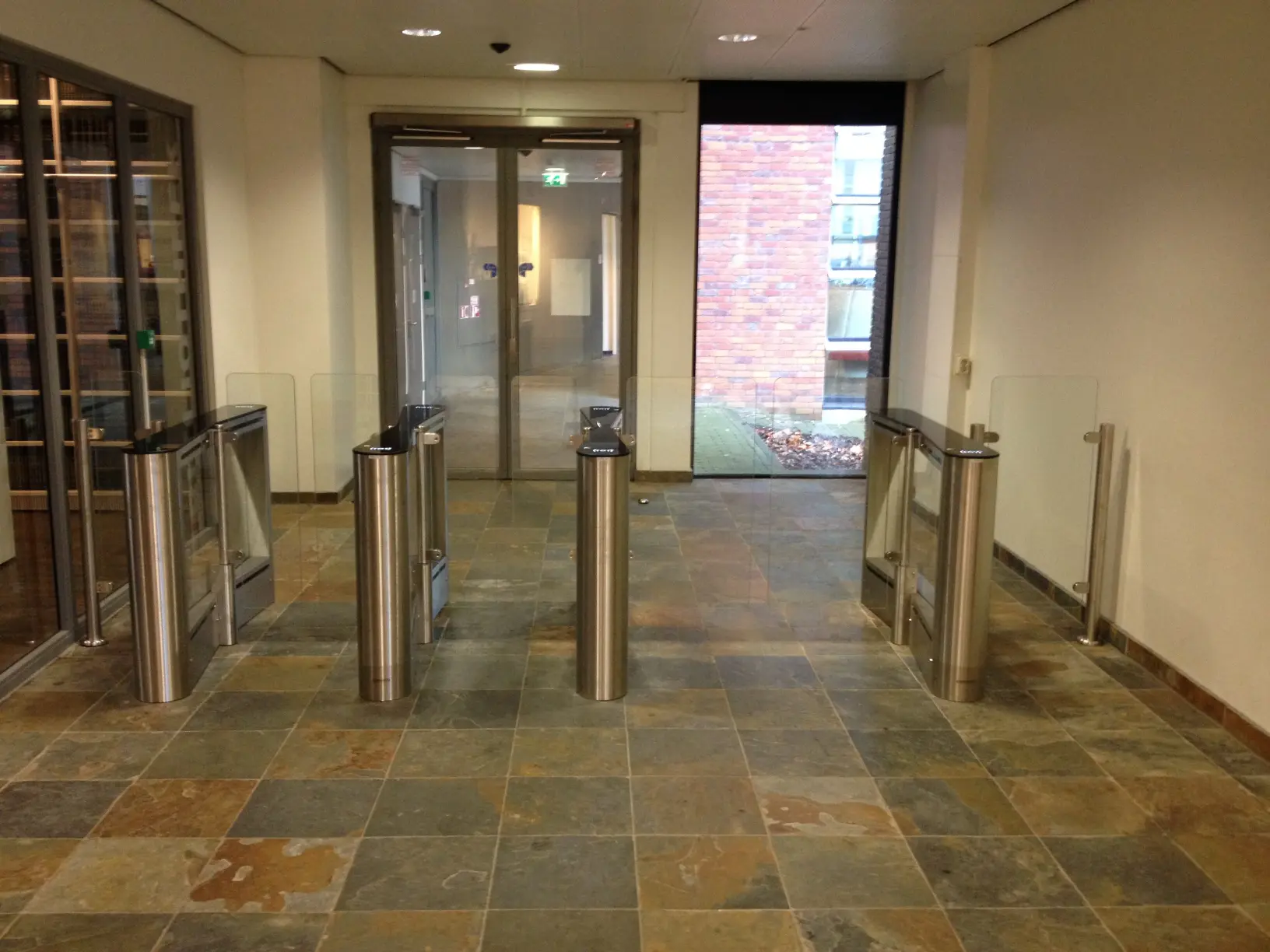 De ingang van een farmaceutisch bedrijf te Amsterdam is voorzien van EasyGates van het type HG. Dit type EasyGate heeft een transparante uitstraling waardoor het open karakter van de ingang behouden blijft. In het midden van de toegang is een breed uitgevoerde EasyGate geplaatst zodat personen met bv transportkarretjes gemakkelijk kunnen passeren.